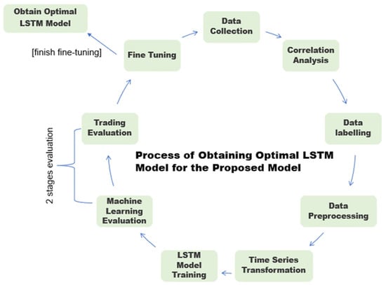 The design of the proposed model involved nine stages (see Figure 2) to determine the optimal LSTM model. Many possible technical indicator combinations will be used to study and obtain the optimal LSTM model so that the proposed model can closely simulate the real-world situation where many investors will use different indicator combinations as the input to the real-time model. Thus, the goal is to determine the optimal LSTM model that can accommodate and achieve averagely promising results across all 100 stocks with different types of input indicator combinations. Each stage of the process of obtaining the optimal LSTM model for the proposed model is discussed as follows: