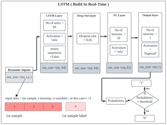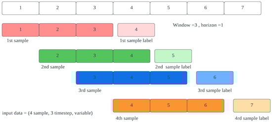 The scaling factors will be calculated based on the training set and then applied to both sets. Additionally, a time-series transformation will be applied as LSTM networks require input in 3D format: sample, time-step, and variable. As shown in Figure 3, the first dimension represents the number of samples, the second dimension represents the number of time steps, and the last dimension represents the number of variables in each time step. The number of time steps and horizons used in the proposed model are 2 and 1, respectively.