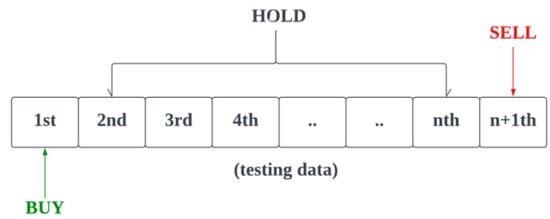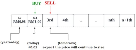 After the input data has been pre-processed, the LSTM model training will begin, followed by evaluation using the testing data. The evaluation process will involve two stages, namely machine learning evaluation and trading evaluation. In the machine learning evaluation, the prediction accuracy of the LSTM model on the testing data will be computed. Additionally, the predicted result score will be divided into buy (greater than or equal to 0.7), hold (between 0.3 and 0.7), and sell (less than or equal to 0.3). So, if the predicted score is greater than or equal to 0.7, the predicted result will be marked as 1 (recommend to buy); otherwise, it will be marked as 0 (not recommended to buy). In contrast, the trading evaluation will involve evaluating the LSTM model as a trading system, where a “buy” operation will be made if the model predicts an “up” trend at any moment during the testing data, and the return on investment will be calculated. Portfolio evaluation metrics such as cumulative return, Sharpe ratio, and maximum drawdown will be calculated to measure the performance of the proposed model in a stock trading simulation. Additionally, the LSTM model’s trading performance will be compared with the buy-and-hold and optimistic strategies, which are the most fundamental strategies used in the stock market. The buy-and-hold strategy involves buying the stock at the beginning of the testing data period and selling it at the end of the period [], while the optimistic strategy buys the stock at the current time step and sells it at the next time step if the current stock price is higher than the previous stock price, expecting the stock price to continue to increase in the future. The performance of the proposed model is expected to outperform these two strategies. After the evaluation process, the results, including prediction accuracy and trading simulation performance, will be presented to users. Additionally, by comparing the performance of the proposed model with these two strategies, users can gain a better understanding of the strengths and weaknesses of the model. Figure 4 and Figure 5 illustrate the buy-and-hold and optimistic strategies, respectively.