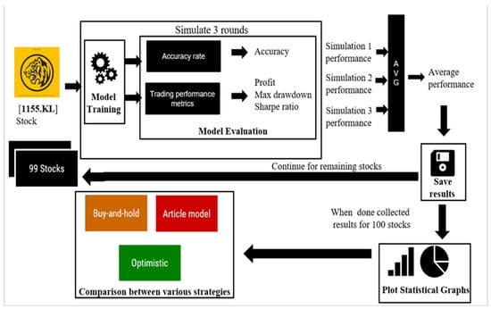 To evaluate the effectiveness of the proposed model, a simulation was conducted to predict the price movement of 100 stocks between 1 January 2019 and 30 June 2022. The model training data did not include stock data between 1 January 2019 and 30 June 2022, to avoid look-ahead bias and allow the proposed model to make predictions based on unseen data. The evaluation of the proposed model was based on four performance metrics: prediction accuracy, cumulative return, Sharpe ratio, and maximum drawdown. The simulation process also compared the performance of the proposed model strategy with the buy-and-hold strategy, the optimistic strategy, and the prediction method used in a previous article [], which selected random indicators and applied feature extraction to filter the best-voted features for training. To account for the random initialization of some LSTM algorithm parameters, such as the weight of nodes in each gate, three simulation rounds were conducted per stock to obtain the average accuracy rate and average trading performance. Figure 7 illustrates the simulation procedure for testing the proposed model’s prediction accuracy and trading performance.