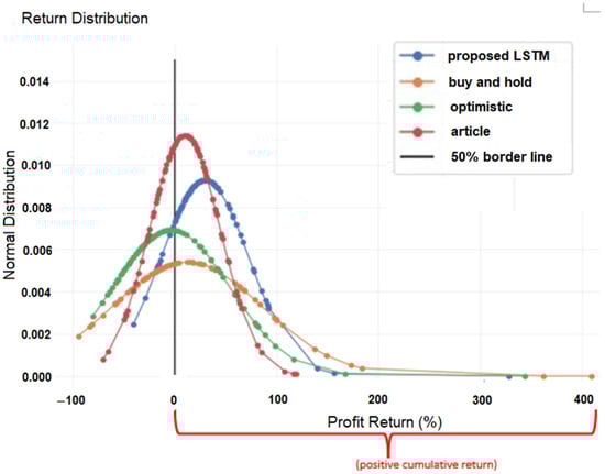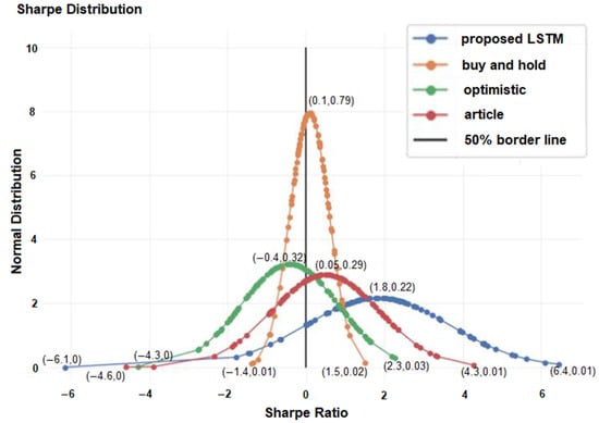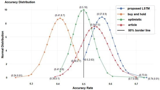 The blue curve represents the proposed model, and each blue dot on the graph represents the average model accuracy of a specific stock. The proposed model achieved at least 50% accuracy for all 100 stocks, which indicates it has passed the first part of the test. Furthermore, the proposed model outperformed the other three strategies, achieving the highest average accuracy rate of around 57%. The prediction approach used in the article [] obtained an average accuracy of 54% and a minimum accuracy of 39%, which is less than 50%. Therefore, the proposed model is better than the prediction approach used in the article []. The buy-and-hold and optimistic strategies achieved significantly lower accuracy rates than the proposed and article models because they lacked statistical analysis. Therefore, machine learning models are expected to outperform these strategies.