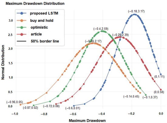 It indicates that the proposed model outperformed the other strategies, achieving a high Sharpe ratio value of 1.83. Figure 11 shows the maximum drawdown distribution, and Table 6 shows the statistic of the maximum drawdown of the 100 stocks for four different strategies.