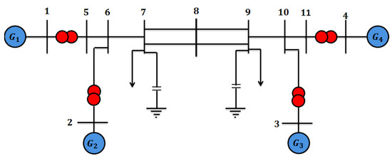 In this subsection, we evaluate the performance of the proposed algorithm in optimizing the design of the proposed controller. The performance of the proposed method in distinct scenarios is studied by considering different working conditions. In this section, a power system with four machines and two areas is considered. The reason for choosing a safe system is the presence of interregional fluctuations, as a lot of research studies focus on investigating fluctuations. The studied system is connected by two 220 kV lines. Also in each area are two generators of 900 MVA and 20 kV. The inertia constant is 1 s in the first region and 6.175 s in the second region, and 413 MW is provided from the first zone to the second zone through transmission lines. Additionally, due to the increase in impedance load from the transmission line to about 140 MW, the system is available. Figure 3 shows the four-machine system with two areas. The left area includes the generators 1 and 2 as well as buses 1, 2, 5, 6, and 7, and the right area includes the generators 3 and 4, as well as buses 3, 4, 9, 10, and 11.