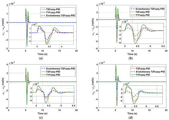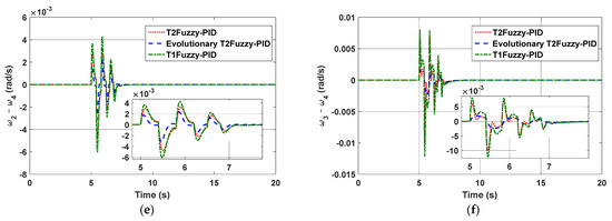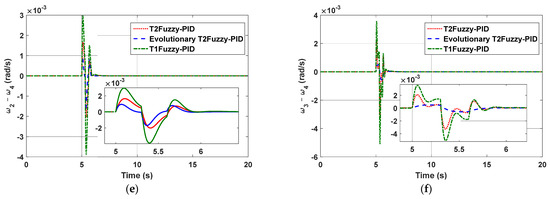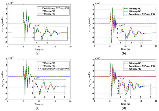 For the purpose of comparing performance, the following three aspects were taken into consideration: type-1 fuzzy-PID, type-2 fuzzy-PID without the evolutionary algorithm, and finally type-2 fuzzy-PID with the evolutionary algorithm. Figure 4a–f show the speed differences between the generators considering the above three controllers. The occurrence of a three-phase short-circuit in bus 8 at the moment of t = 5 s for a period of 0.1 s was tested. As seen in the figure, the proposed approach has the beneficial capability of decreasing settling time, and the amount of bruising and lowering also decreased dramatically.