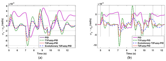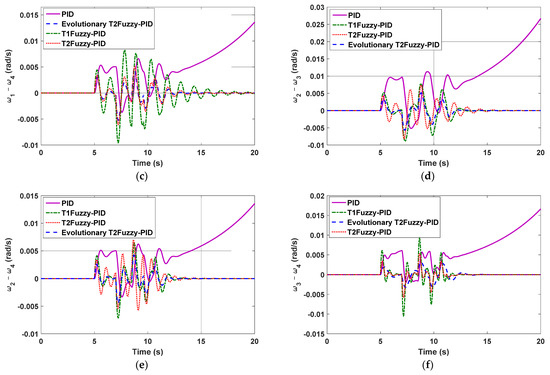 In Figure 5a–f and Figure 6a–f, after 0.1 s, the protection relays operated and removed the faulty line, but in Figure 6, it is assumed that the relay does not operate, and the line does not exit. However, all three controllers were able to increase the rotation speed of the generators to zero by increasing their power. As shown in Figure 6a,b, a traditional PID controller was added to this scenario to highlight the performance of adaptive control systems. The PID control system is not capable of tolerating faults, and it diverged. For greater clarity, the speed differences between generators 1 and 3 as well as generators 3 and 4 are magnified and shown in Figure 7.