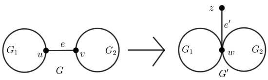 Let be a cut edge, but not a pendent edge, in the connected graph G. is obtained by contracting the edge e into a vertex w and adding a pendent edge to this vertex, (see Figure 2). Then, .