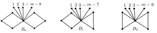 Let be the set of connected bicyclic graphs with m-edge and three cycles; namely, if , then it must have a subgraph isomorphic to .