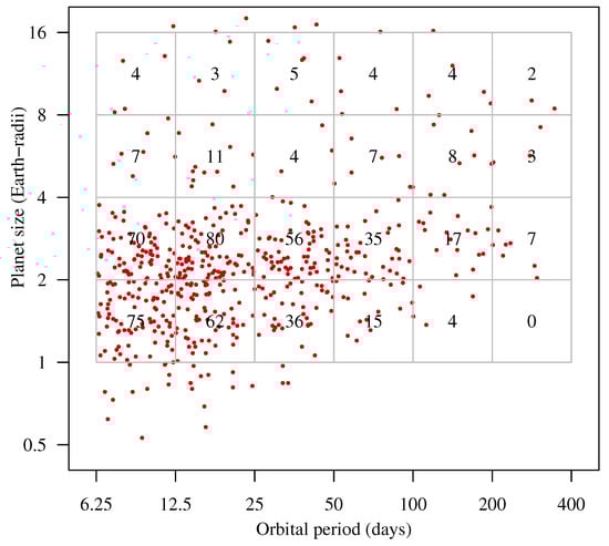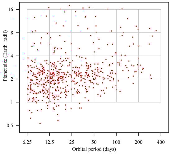 To model the occurrence distribution of planets as a function of the planet period and radius, Petigura et al. (2013) [5] considered transiting planets that are all hosted by GK-type stars. They defined GK-type stars as those with surface temperatures of and gravities of . Furthermore, these planets are restricted to the brightest GK-type stars observed by Kepler (–). These 42,557 stars have the lowest photometric noise in the Kepler survey, thereby maximizing the detectability of Earth-size planets. In the present work, we mainly studied the occurrence rate of planets based on the catalog by Petigura et al. (2013) [5], which can compare our findings with their seminal work by adopting the same study region. Figure 1 shows the scatter plot of the data. Let be the orbital period (days), be the planet size (Earth radii), and be the region of interest for this work; it is divided into the grids shown in Figure 2. Let record the number of events in grid for . Please note that the region D is the same as in Petigura et al. (2013) [5].