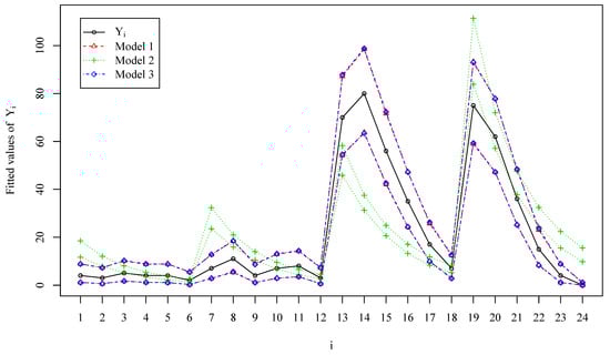 Next, we first examined the hypothesized model (i.e., Equations (1)–(3)) that is suitable for analyzing the occurrence rate of Earth-size planets in the Kepler survey. In this paper, we conducted a simulation study based on the Pearson chi-squared test to illustrate the goodness of fit of the used model (i.e., Equation (8)); Model 1). In addition, as listed in the bottom of Table 2, a model (i.e., Model 2) with only the regressors and a model (i.e., Model 3) with only the spatial random error process were also used for comparison. Let ; , be independently generated from , with E being the expected number of exoplanets evaluated according to the observed data , where is an estimate of the occurrence rate based on the posterior medians of under the used model (i.e., Model 1, Model 2, or Model 3) and , represents the t-th simulation. For each simulation replicate, the goodness-of-fit test statistic is computed in the following manner: