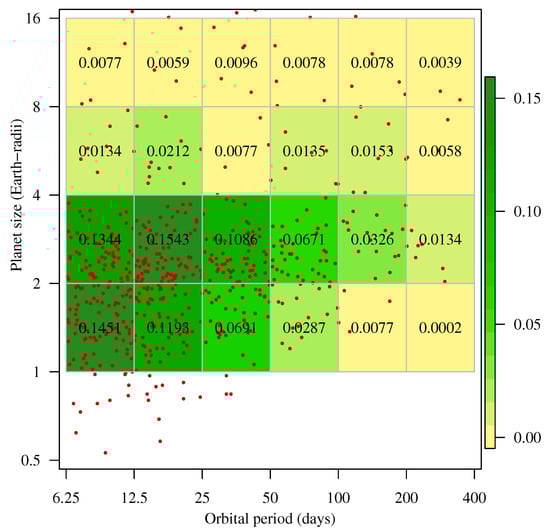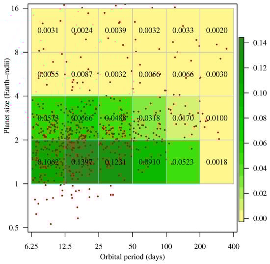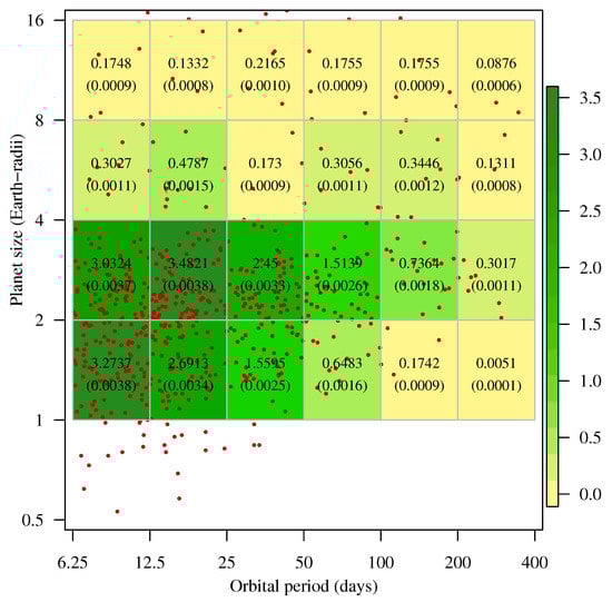 From Table 4, we find that (1) for cases (ii), (iii), (iv), (vii), and (ix), the occurrence rates obtained from the proposed method are larger than those of Petigura et al. (2013) [5] by approximately a factor of two; (2) for cases (i), (v), and (vi), the occurrence rates obtained the proposed method are almost the same as Petigura et al.’s (2013) [5]; and (3) for cases (viii) and (x), the occurrence rates obtained by Petigura et al. (2013) [5] are larger than the proposed method herein. Because the proposed model considers the information of neighbors, the grid density is high, which will produce higher occurrence rates. On the contrary, if the grid density is low, lower rates will occur. Furthermore, both methods confirm the occurrence rates of planets with (i) 5–100 d and size 8–16 ; (ii) 25–50 d and size 1–16 ; and (iii) 50–100 d and size 1–16 .