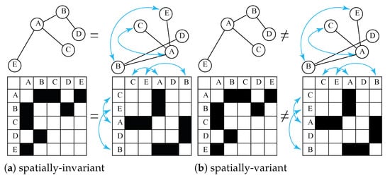 We can represent a graph with an adjacency matrix where m reflects the number of nodes. Each element of this matrix defines the link between the i-th and j-th nodes. In the spatially invariant graph, if you shuffle its edge list or the columns of its adjacency matrix, it is still the same graph (See Figure 1a). Figure 1 shows the explanatory case of a small graph consisting of the five nodes (A, B, C, D, E) and four links (A-E, A-C, A-B, B-D). The different panels illustrate the cases of the spatially-invariant (a) and the spatially-variant (b) graphs. The figure also presents their adjacency matrices. On the left, the matrix has columns and rows ordered in alphabetical node order: on the row for node A (first row), we can read that it is connected to E and C. On the right-hand side, the same graph is shown with the different locations of the nodes. On the right, the adjacency matrix is shuffled (the columns are no longer sorted alphabetically). So in the case of the spatially-invariant graphs (a), two matrices give a valid representation of the graph (A is still connected to E and C). For the spatially-variant graphs (b), a shuffled adjacency matrix cannot suffer as a valid representation.