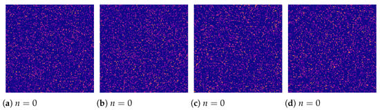 Examples of the adjacency matrices of the negative class. The pixel’s brightness reflects the link weight. Panels (a–d) correspond to the different values of n defining the difference in the link weight between the active regions and the rest of the graph. Since in the negative class, we sampled the link weights from a single distribution for all regions, adjacency matrices demonstrate the homogeneous distribution of the weights that barely depends on n.