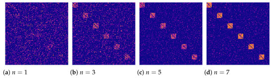 The value of n is a step number that signifies the distance between and (Figure 2). At (Figure 2a) the distributions are the same, meaning that links’ weights were sampled from the same distribution in the entire graph. This results in the same structure across both classes. At , (dashed line in Figure 2b), meaning that the nodes in the active regions get obtain stronger link weights. Further increase of n results in the strengthening difference in the link weights between the active regions and the rest of the graph (Figure 2c,d).