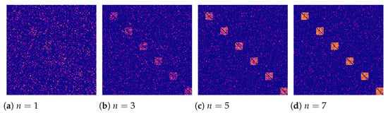 To test if the deep learning algorithms may handle spatially-invariant graphs, we created two datasets. Each dataset has a positive and a negative class. Recalling Section 2.1, the graphs of negative class are generated with parameter . By design, such the graphs do not have regions. The weights for nodes’ connections are sampled from the half-normal distribution . Figure 3 shows the typical adjacency matrices for the negative class. Panels (a-d) correspond to the different values of n defining the difference in the link weight between the active regions and the rest of the graph. Since in the negative class, we sampled the link weights from a single distribution for all regions, adjacency matrices demonstrate the homogeneous distribution of the weights that barely depends on n.