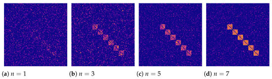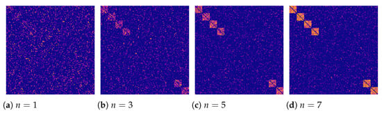 Examining the adjacency matrices, one can see that the graphs in the positive class have a certain pattern on the adjacency matrix (compare Figure 3 and Figure 4), which becomes more pronounced with the growing n. This pattern has a diagonal structure and depends on the ordered number of active regions. When activating the odd regions, this pattern takes the form of an alternating sequence of squares.