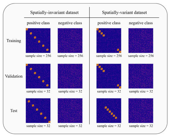 This section provides a description of both datasets: spatially-variant and spatially-invariant. It should be noted that training and test tests of positive class within each dataset were different, while negative class was always the same.