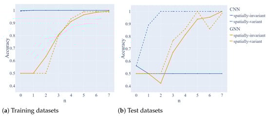 Accuracy of GNN (orange curve) and CNN (blue curve) for the spatially-variant dataset (dashed line) and spatially-invariant dataset (solid line) depending on the step number n. Panels (a,b) correspond to the training and test set.