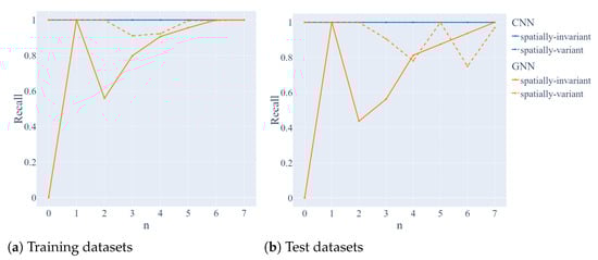 Recall of GNN (orange curve) and CNN (blue curve) for the spatially-variant dataset (dashed line) and spatially-invariant dataset (solid line) depending on the step number n. Panels (a,b) correspond to the training and test set.