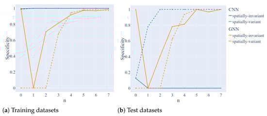 Specificity of GNN (orange curve) and CNN (blue curve) for the spatially-variant dataset (dashed line) and spatially-invariant dataset (solid line) depending on the step number n. Panels (a,b) correspond to the training and test set.