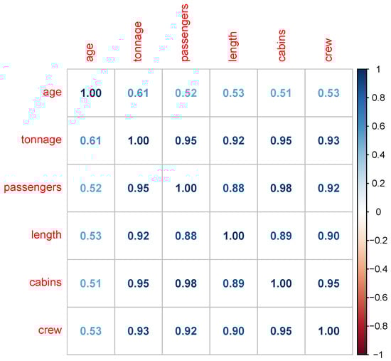Figure 1 shows the correlation plot of the data, where one can see that most of the variables are highly intercorrelated. For example, correlation between passengers and tonnage is 0.95. Similarly, the correlation between passengers and cabins is 0.98. By looking at the correlation plot, we can say that variables are highly correlated with each other, and there may exist multicollinearity problem in the data. To verify the existence of multicollinearity in the data, we calculated the variance inflation factor (VIF) from the data. VIF is one of the widely used methods to detect multicollinearity in any data set. It measures the strength of linear association (correlation) between the predictor variables in a regression model. In THE case of multiple regression, the VIF for the jth regressor variable can be defined as