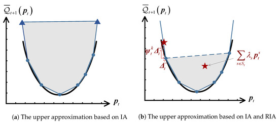 In traditional RDDP, the inner approximation (IA) method is employed to construct by a convex hull above in the upper approximation, as shown in Figure 3a. However, in order to obtain a bound over the entire domain, all extreme points need to be enumerated. Since the number of all extreme points increases exponentially with the dimension of dispatch decision , IA will lead to an overly-complicated problem when the quantity of units is large. Compared to IA, we propose the relaxed inner approximation (RIA) method formulated as (30), which constructs an approximate convex hull as drawn in Figure 3b.