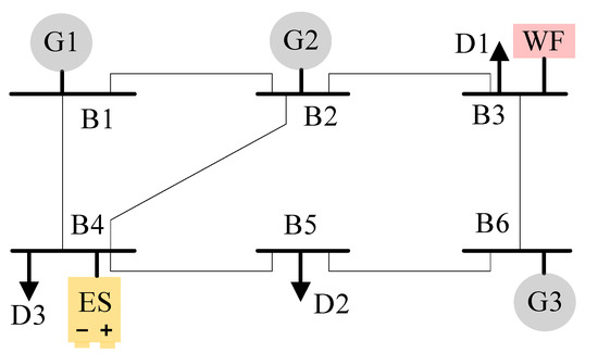 The selection of systems for testing can be divided into two parts: normal systems involved in modified IEEE 6-Bus system (MI6B) and modified IEEE 300-Bus system (MI300B); and large-scale systems from 2000 to 6495 buses. Among them, the system load demand, aggregated available and each-period most-recent predicted wind power use the real data from EirGrid [34], whose value is adjusted according to the total capacity of system. Figure 5 shows the topology of MI6B. There are three dispatchable generator plants and three loads. One ESS and one wind farm are also added. The topology of MI300B is consistent with [35], where the parameters of conventional generators and proportion of each load remain unchanged. The detailed device parameters of MI6B and other parameters of MI300B are given in [36]. The large-scale systems for testing contain the modified PGLib Case2000, Case2316, Case4661, and Case6495 [37], in which the position of added wind farms and ESS and day-ahead UC plan are given in [36]. For each case, the aggregated capacity of wind farms is equally shared among each wind farm. The SOC limit of the ESS is set to be the mean value of the maximum output level of all dispatchable generators. The maximum charging and discharging rate of the ESS are set to be 60% of the SOC limit.