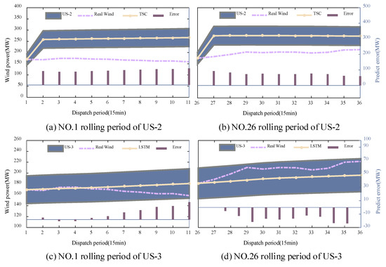 Since the fluctuant region of US is shaped as a box interval based on the predicted available wind power, the ability of US to cover future real wind scenarios exactly depends the accuracy of utilized predicted technique. As shown in Table 2, the predicted results within the whole simulation of real-time dispatch in MRRTD using US-3 perform better. Specifically, the uncertainty interval and corresponded real-observed wind power with the rolling of MRRTD using US-2 and US-3 at the periods 1 and 26 of 8 December 2021 are plotted in Figure 6, in which is applied.