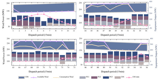 To examine the effectiveness of MRRTD on normal systems, MI6B and MI300B are chosen as the testing object, where is set as the deviation parameter. The optimal real-time dispatch decision on MI6B at period 1, 44, 65 and 86 of 8 December 2021 made by MRRTD under the worst-case scenario of subsequent dispatch periods within the rolling horizon is drawn in Figure 7.