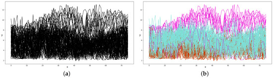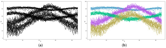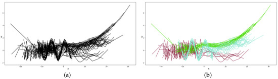 Experimental results of the simulation dataset. The x-axis represents the input variables and the y-axis represents the output (or response) variables . (a) 50 curves of three MGPFRs without their labels (i.e., the algorithm’s input). (b) 50 curves of three MGPFRs with the predicted labels (i.e., the algorithm’s predicted labels; the same color represents the same label).