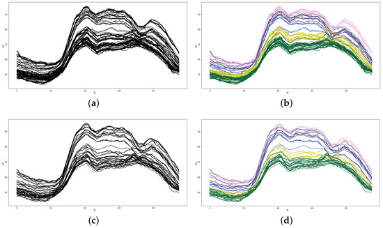 In this particular dataset, there are unlabeled curves in total and there are 87 sample points in each curve, i.e., . The initial values of the parameters are set in the following way: i.i.d. for i.i.d. for i.i.d. for . When selecting the B-spline functions, we use the same method described in Appendix B.1. However, we delete two interpolation points, , because all the sample curves have the identical inputs. The learning rate with respect to Equation (A11) is 0.01 and we repeat Equations (A8)–(A11) for times to update in each iteration. The annealing parameter . The stopping criterion for iteration is . It was found by our experiments that the algorithm converged after about 25 iterations; thus, we set for simplicity. Actually, the total training time of our algorithm is 2013.9 s.