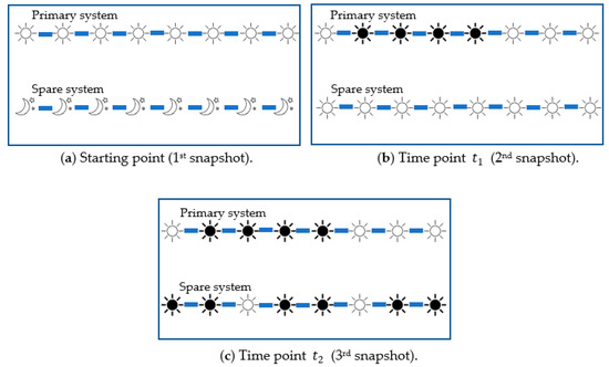 As it is easily observed, the second snapshot illustrates a possible scheme (e.g., at time point ) which results in the overall failure of the primary structure. Until the time point arrives, the secondary structure remains inactive and therefore, all of its components remain in a working state.