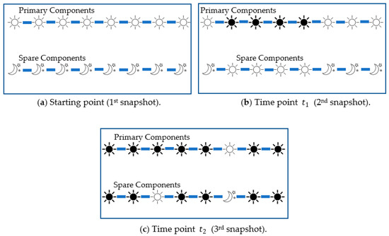 Figure 2 displays three snapshots of the above-mentioned reliability structure at different time points of its operation. The first snapshot shows that two sets of independent components formulate the resulting combined 3-consecutive-2-out-of-8: F and consecutive 4-out-of-8: F structure with cold standby redundancy at the component level.