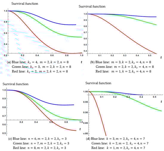 We first focus on the survival function of the structure with redundancy. More specifically, the impact of the design parameters on the survival function is investigated. Figure 3 displays the survival probabilities for different design of the underlying system with redundancy at the system level. We assume that the lifetimes of both the primary and spare systems follow an exponential distribution with a unit mean. The numerical results provided at Figure 3 were produced with the aid of part (i) of Proposition 1 (see Section 3 of the present manuscript).