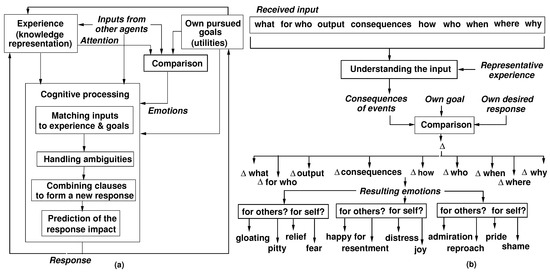 After input understanding, an LRGA’s attention and emotions are computationally modeled by comparing its own experience and goals to the input. The model is based on appraisal theory in psychology [48,49]. Figure 1b illustrates an LRGA’s emotion formation. The consequence of an understood input, which is a prediction of the input effects, is compared with the goals of the agent or its previous responses. The comparison produces a set of differences (s), with a specific for each input fragment (clause), e.g., what, for who, output, and so on. As shown in Figure 1b, specific emotions emerge depending on the nature and degree of unexpectedness of s, and whether s refer to the agent (for self?) or to other agents (for others?). Section 4 details the implementation of the attention and emotion models.