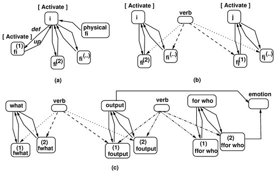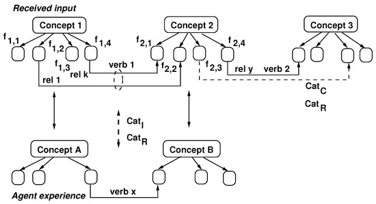 Understanding input responses through the maximization in Equation (5) uses clause matching and stitching, as shown in Figure 3. Concept features are labeled as in the figure and pertain to the four categories, , , , and . Figure 3 also shows the relations , , and introduced by verbs and that connect the features of the three concepts (i.e., nouns) in the figure. Depending on the features involved in the most representative relations that connect it, a concept is characterized by its typical purpose, defined as the most frequent relations of its features. Some ideas about response understanding are also discussed in ref. [54].