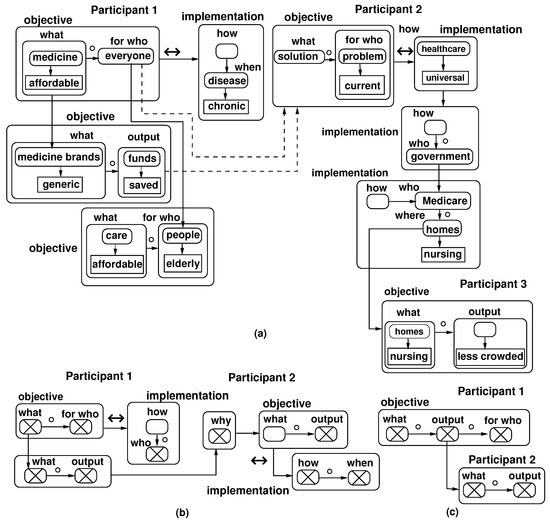Figure 4 presents agent interactions for a case in which agents agreed with each other as well as for two cases in which they disagreed. The figure shows how different kinds of clauses connect to each other during interaction while agents jointly solve a problem. It uses the following conventions. As it is not important in this example what each clause actually means (i.e., the words that form it), just their kind, the clauses were depicted as crossed boxes. However, to give more insight, some clauses were explicitly described by indicating their word structure. White boxes are clauses missing from Equation (1). Arrows between clauses, objectives, and implementations express associations, including operators ∘ and ↔. The figure is based on the results of the cognitive experiment described in ref. [4]. Participants were randomly grouped into teams of four and asked to jointly devise solutions to improve the healthcare system in the USA. Each participant could provide an unlimited number of inputs, including responses to inputs offered by other team members.