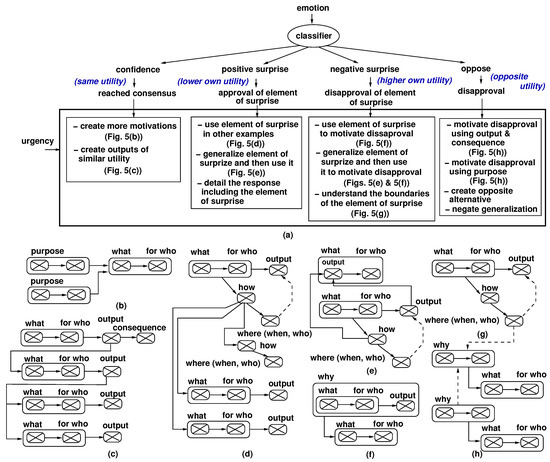 Importance of emotions during response creation: (a) using emotions to select a response generation pattern, (b,c) adding motivations and outputs to reinforce a response, (d) detailing a response using an element of surprise, (e) generalizing an element of surprise, (f) generalizing an element of disapproval, (g) understanding the boundaries of an element of surprise, and (h) disapproval motivation.