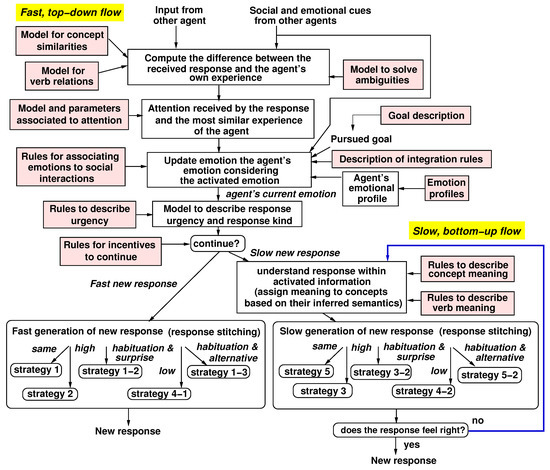 Learning and response generating agents (LRGA) communicate with each other through statements to present their ideas as part of problem solving. LRGAs produce new statements (responses) by a cognitive-processing-inspired method using their own experience, their own pursued goals and priorities (modeled as utilities), responses from other agents, and emotions. Figure 1a summarizes the process through which LRGAs create new responses during their interactions. Responses can be created through two flows [6,45,46,47]: a fast, top-down flow and a slow, bottom-up flow. The fast flow reacts to the received inputs, present emotions, social interactions, and drawn attention to create responses that incrementally change the input or experience. The slow flow offers planned solution building that uses the agent’s learning after generating a number of fast responses. Its responses are at higher levels of abstraction. Urgency selects between the two flows.