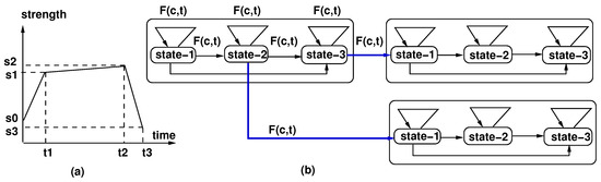 Figure 7. Emotion implementation: (a) emotional state strength variation over time and (b) rule definition for emotion integration. Parameter c is a cue, parameter t is time, and is the controlling function. - Emotion transitions during interactions: The predefined rules for emotion integration change emotions as shown in Figure 7b. Each emotional state has sub-states, e.g., state-1, state-2, state-3, which correspond to the emotion strength in Figure 7a. Transitions between sub-states are controlled by cues (c) and the passing of time (t). The nature of the transitions and their controlling functions (describing conditions) are specific to each agent.
