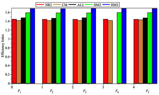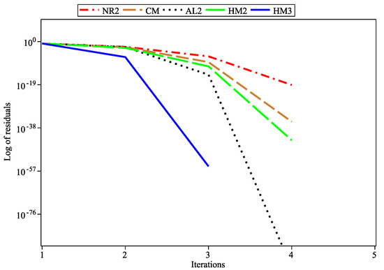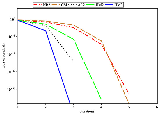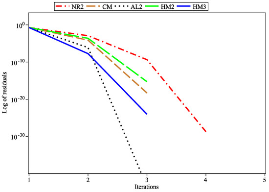 Moreover, Figure 1, Figure 2, Figure 3, Figure 4 and Figure 5 are presented to provide a more comprehensive description of the convergence, accuracy, and reliability of the proposed Algorithms 2 and 3. These graphs display the logarithm of residuals at each iteration for the nonlinear equations listed in Table 1. Additionally, Figure 6 is included, which compares the efficiency of the suggested two- and three-step methods with the alternative methods that have been considered.