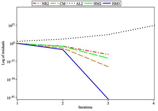 The purpose of this section is to compare the performance of the proposed Algorithms 2 and 3 with the Noor method (NR2) [2], the Chun method (CM) [23], and the Sehati et al. method (AL2) [11]. The comparison is aimed at demonstrating the applicability and efficacy of the newly proposed methods.