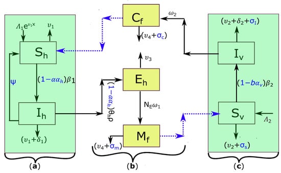Transmission dynamics of schistosomiasis in (a) human definitive hosts (susceptible human ; infected human ), (b) schistosomiasis parasite forms (cercariae ; parasite eggs ; miracidia ), and (c) intermediate host snails (susceptible snail ; and infected snail ). The blue dotted arrows represent the interaction between free-living schistosomiasis parasites and the respective hosts. All parameters are as defined in Section 2.1, and the control parameters are shown in blue.