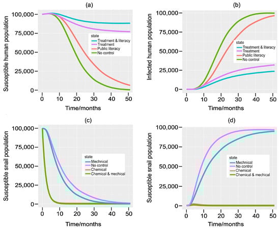 Comparisons between treatment and public literacy targeting the populations of (a) susceptible humans, (b) infected humans, and molluscicide (chemical) and the mechanical strategies targeting (c) susceptible snails and (d) infected snails of schistosomiasis in contrast with no control measures.