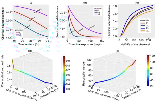 Various molluscicides are regulated by temperature according to their half-lives and durations of chemical exposure to snails. A molluscicide is classified as a non-permanent molluscicide (NP) with a half-life of , a persistent molluscicide (P) with a half-life of , or a very-permanent molluscicide (VP) with a half-life of . (a) Shows variations in the temperature of the environment and the duration of chemical exposure (b) for different chemicals affecting the death rate of targeted host snails. (c) Shows the effect of chemicals with different half-lives on the death rate of different target species (susceptible snails , infected snails , cercaria , and miracidia ). At the same time, the effect of combined chemical exposure and temperature on the death rate of host snails and the subsequent reproduction number is shown in (d,e).