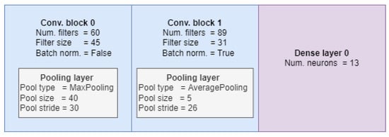 We expect that setting the distribution index for the polynomial mutation operator [19] is more suitable for our experiments, where we run the GA for relatively few generations. As we mentioned before in Section 4.4, smaller values of cause the mutated children to be less similar to their parents. Hence, using a small distribution index could be beneficial in terms of finding better-performing networks in fewer generations. However, one also needs to strike a balance to avoid potentially damaging mutations by choosing a value that is too small [33]. For this reason, we settled for . Similarly, a larger truncation proportion would yield better results since, in this way, the diversity of the population (which is already limited in size) is preserved. However, its influence is likely not as significant as that of the chosen crossover and mutation configurations since those can modify the population more straightforwardly. Finally, we expect either crossover strategy to perform well since both allow the algorithm to find effective architectures in the predefined hyperparameter ranges. The performance of the final network obtained from the best run for each parameter combination is depicted in Figure 3.