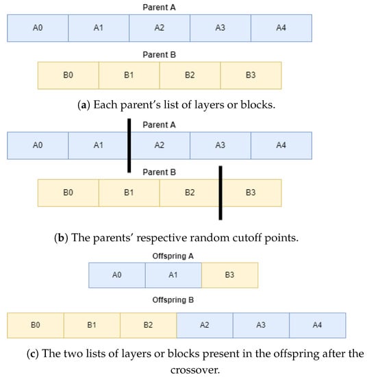 Our algorithm uses one of two possible crossover types, i.e., one-point crossover or parameter-wise crossover; both are common crossover strategies in genetic algorithms. The performances of these two methods are evaluated in Section 5.2. To enact a one-point crossover with two parents, we apply one-point crossover separately on the parents’ lists of convolutional blocks and dense layers. For a list of either convolutional blocks or dense layers, we achieve this operation by picking a random cutoff point in both parents’ lists of the corresponding layer type. The first child’s list of that type is then created by connecting the first parent’s list before its cutoff point to the second parent’s list after its cutoff point; the second child’s list is created by connecting the remaining units. The one-point crossover operation is then finalized by randomly dividing the parents’ optional pooling layers that are present in the absence of convolutional blocks among the offspring (see Figure 2).