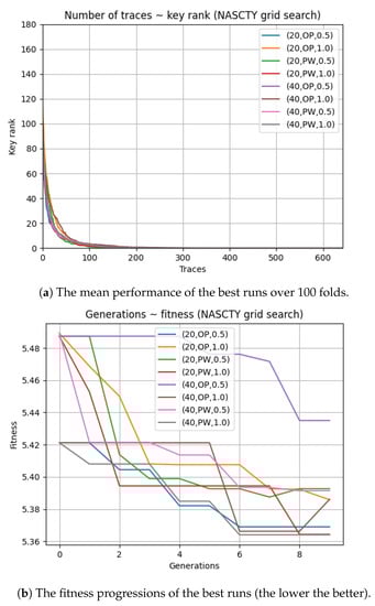 Figure 3a implies that each parameter combination is capable of producing fit architectures for the considered ASCAD traces. Similarly, the fitness plots of the best runs over generations shown in Figure 3b demonstrate that the best genome’s CCE, i.e., the validation loss, can improve significantly in as few as ten generations, regardless of the parameter combination under consideration.