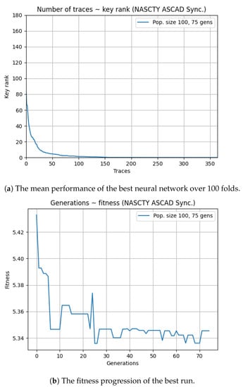 As shown in Figure 4a, the best-obtained network converges smoothly. Ultimately, the network breaks the target into 314 attack traces and achieves a mean incremental key rank of 0.51857. The best fitness value progresses (Figure 4b) continually after ten generations have passed, then stagnates well before the seventy-fifth generation is reached. Moreover, despite the difference in the population size and the number of generations, the best network is outperformed by several of the NNs obtained with our grid search experiments. This observed fitness stagnation implies that the algorithm may be prone to becoming stuck in local optima. Typically, the mutation is the source of the global search in a GA, so we recommend that future work evaluates lower values of for polynomial mutation strategies or possibly more perturbing mutation strategies.