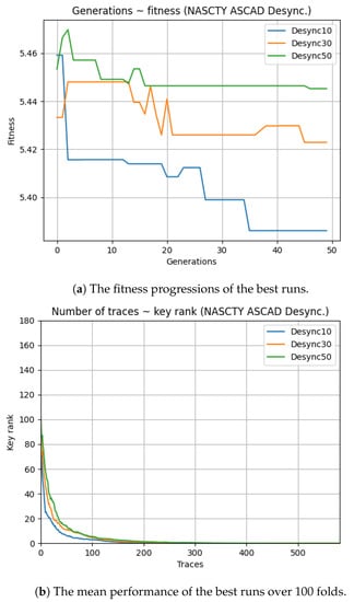 Due to the fitness progress observation in the previous experiment, we ran NASCTY on the masked and desynchronized ASCAD traces for 50 generations instead of 75. The results for desynchronization levels 10, 30, and 50 are displayed in Figure 5.