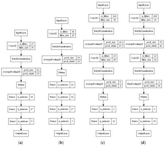 Best architectures produced by NASCTY for masked ASCAD traces protected with several desynchronization levels. (a) Synchronized; (b) desynchronization level 10; (c) desynchronization level 30; (d) desynchronization level 50.